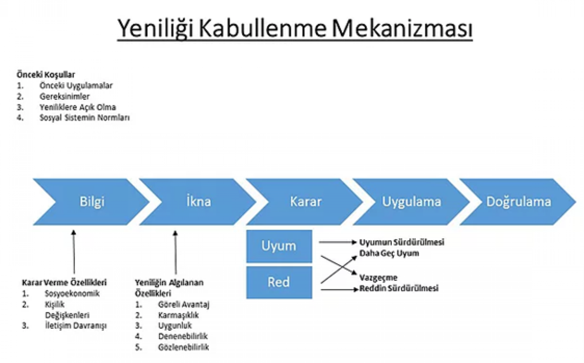 Yeniliğe uyum veya ret kararı verirken bilgi beş aşamadan geçmekte. Bu beş aşama; bilgi, ikna olma, karar, uygulama ve doğrulama. İlk aşamada birey yenilik ve işlevleri hakkında bilgi edinir. İkna olma aşamasında yeniliğin kendisi için avantaj ve dezavantajlarını değerlendirerek, yeniliğe tutumunu biçimlendirir. Karar aşamasında yenilik hakkında ek bilgiler edinir ve yeniliği kabul ya da ret kararı verir. Bu aşamada özellikle çevresindeki bireylerin değerlendirmelerinden etkilenir. Dördüncü aşama olan uygulama yeniliğe uyum kararı verildiğinde gerçekleşir. Son aşamada birey uyum kararını doğrular ve güçlendirir.